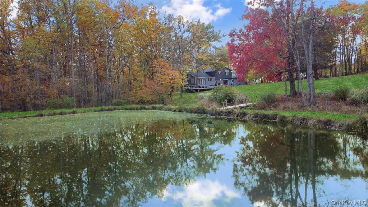 Dream location...complete seclusion, yet perfectly central. Tucked away on 6.7 pristine, private acres, this extraordinary home is a nature-lover's sanctuary: a 130-foot stocked pond, an all-season babbling brook, and miles of serene forested views create a peaceful backdrop for everyday living and effortless entertaining. Architectural character and warmth define the interior. Soaring knotty-pine ceilings, exposed beams, and rich, beautifully finished hardwoods flow throughout, while walls of windows invite the outdoors in at every turn. Intricate woodwork, built-ins, and custom details combine with an open, airy floor plan to create spaces that feel both grand and intimately welcoming. The eat-in kitchen is a chef's delight w soft maple cabinetry, elegant Corian counters, a vaulted ceiling opening to the second floor, SS appliances, and a built-in pantry. A gracious open-concept formal DR and LR flow to expansive decking overlooking the pond and grounds.. ideal for morning coffee, sunset cocktails, or al fresco dining. The welcoming family room is a cozy retreat with a wood-burning fireplace and supplemental woodstove, warm bay windows framing the landscape, and abundant space for lounging, reading, or family movie nights. A convenient first-floor bedroom and full bath provide flexibility for guests, multigenerational living, or a home office. Upstairs, the private primary ensuite is an impressive haven: a tranquil bedroom with a private balcony that overlooks the pond, shaded by a majestic 100-year-old elephant ear tree. Striking sliding French doors reveal a split spa bath. An equally stunning second bedroom showcases exposed beams and dramatic transom window accents. Recent improvements enhance the property's beauty and peace of mind: a brand-new roof and updated Andersen windows ensure energy efficiency and durability. Oversized two car garage, workshop, and partially finished walk-out basement. The grounds are a masterpiece of natural and intentional landscaping... mature trees, natural rock walls, and tasteful hardscaping create intimate outdoor rooms, meandering paths, and private vantage points across the acreage. The pond is stocked and accessible, offering opportunities for quiet fishing, reflective mornings, or wildlife observation. The brook's gentle soundtrack changes with the seasons, ensuring year-round enjoyment. Location is exceptional: situated within the highly sought-after Millbrook school district, the home is centrally placed for commuting, shopping, dining, and outdoor r